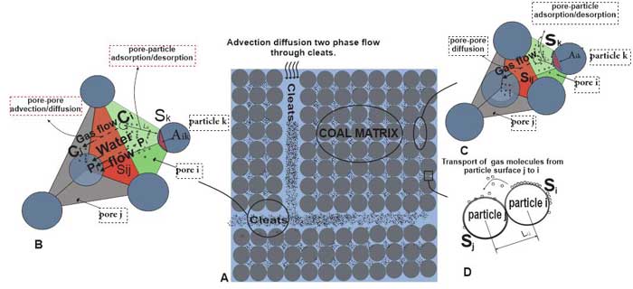 Le gaz de charbon (CBM) est généralement extrait par pompage des eaux souterraines. Sa récupération pourrait être améliorée par injection de CO2. Dans la méthode de récupération assistée de méthane (ECBM), le CO2 est stocké en permanence dans le charbon par adsorption préférentielle, tandis que le méthane est progressivement désorbé et libéré. Les formations de charbon sont des systèmes complexes à double porosité/perméabilité caractérisés par une matrice poreuse, coupée par un réseau de fractures orthogonales. Le méthane est principalement piégé sous forme de couche adsorbée à la surface des micro-pores contenus dans la matrice de charbon tandis que le gaz et l’eau sont transportés par des processus d’advection/diffusion à travers les fractures (limets). De plus, le comportement de gonflement/retrait du charbon induit par les mécanismes d’adsorption/désorption de CH4/CO2 peut considérablement affecter la perméabilité et donc la production de CBM.